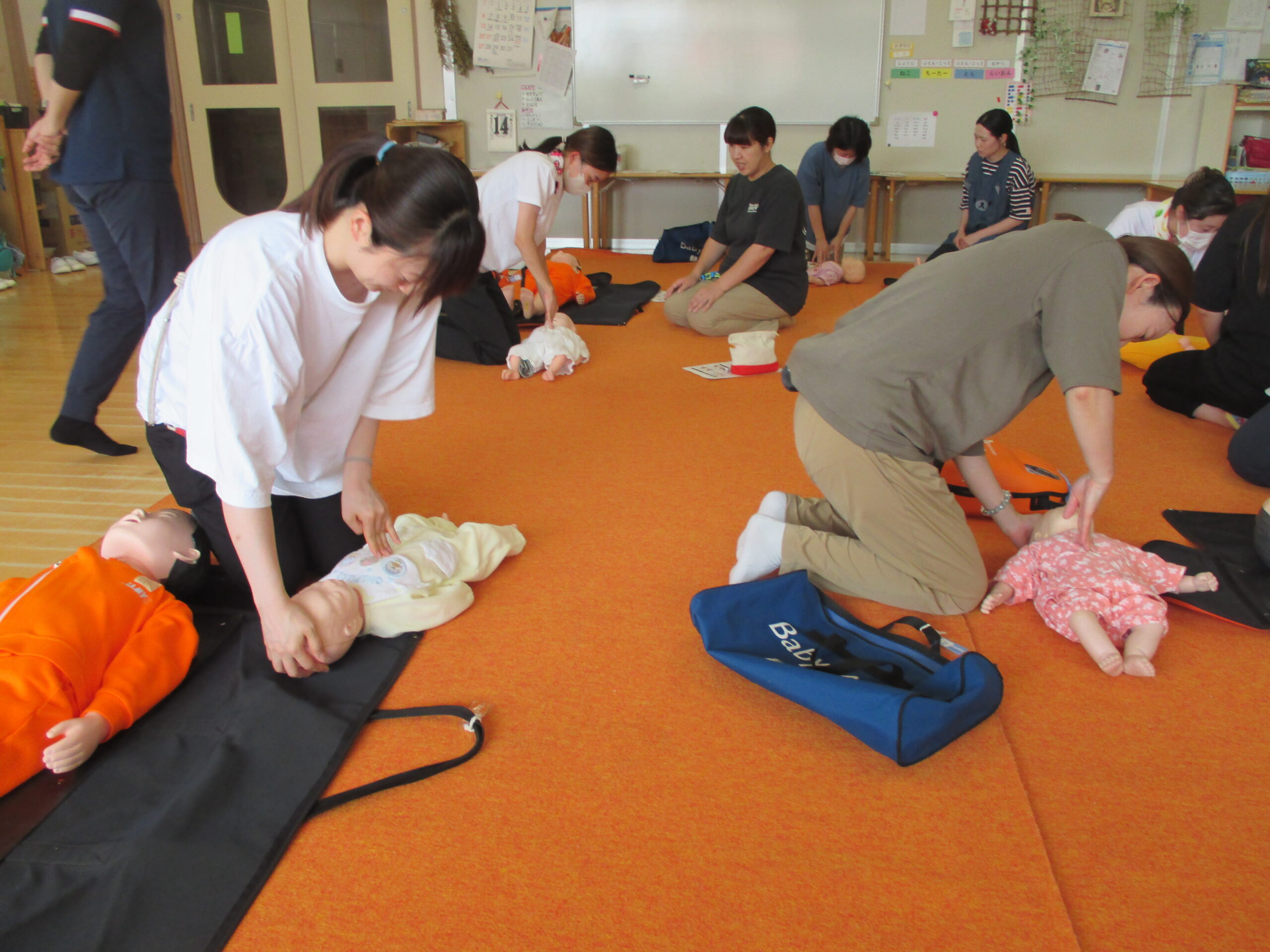 年に一度、子ども達の命を守る為に、AEDの使い方や気道異物除去のやり方など救急救命措置の講習を受けています。今年度は7月14日に受けました。